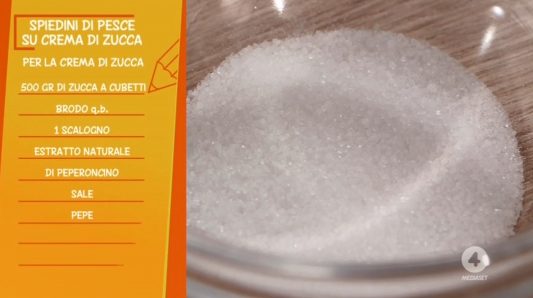 La cuoca casalinga Anna Moroni, all’interno della puntata odierna della nuova stagione di Ricette all’italiana, il programma di Rete4 condotto da Davide Mengacci, in onda dal lunedì al sabato prima e dopo il Tg4, ha preparato gli spiedini di pesce su crema di zucca.