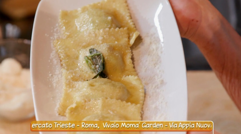 Prepariamo la pasta all’uovo con 200 g di semola e 2 uova. Tiriamo la sfoglia sottile, mettiamo sopra il ripieno a mucchietti e richiudiamo la pasta sul ripieno, facendo uscire l’aria e sigillando bene i bordi. Lessiamo in acqua e ripassiamo in padella con burro e salvia.
