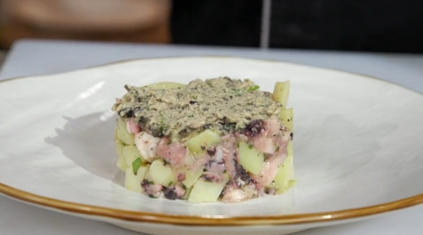 Posizioniamo il coppapasta su un piatto da portata. Lo riempiamo con l’insalata di polpo e patate, quindi finiamo con uno strato di salsa e pressiamo. Eliminiamo il coppapasta ed affianchiamo delle quenelle di salsa tapenade e dei fiori eduli.
