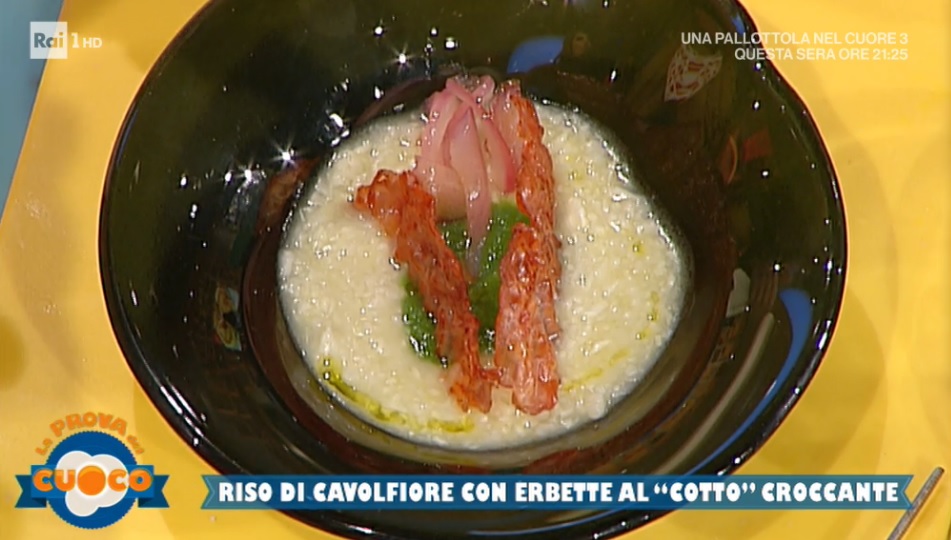 In un piatto fondo, creiamo un fondo di cavolfiore. Al centro mettiamo un paio di cucchiai di crema di scarola, un po’ di cipolla caramellata e le fette di prosciutto croccante.