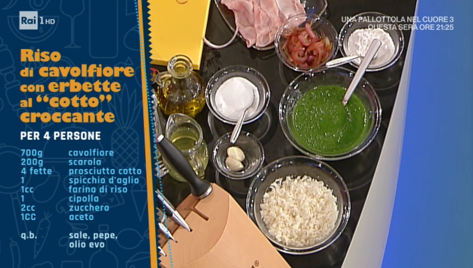 - 700 g cavolfiore, 200 g scarola, 4 fette di prosciutto cotto, 1 spicchio d’aglio, 1 cc farina di riso, 1 cipolla, 2 cc di zucchero, 1 cc aceto, sale, pepe, olio evo