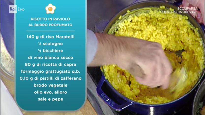 - 140 g riso Maratelli, mezzo scalogno, mezzo bicchiere di vino bianco, 80 g ricotta di capra, formaggio grattugiato, 0.10 g pistilli di zafferano, brodo vegetale, olio, alloro, sale e pepe