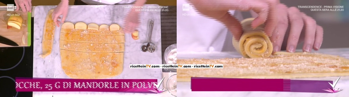 Per le rose di mela: in una ciotola, mescoliamo le mandorle in polvere, lo zucchero di canna e la cannella. Tagliamo le mele a fettine, mantenendo la buccia rossa. Devono essere sottilissime, si consiglia l’utilizzo di una mandolina.