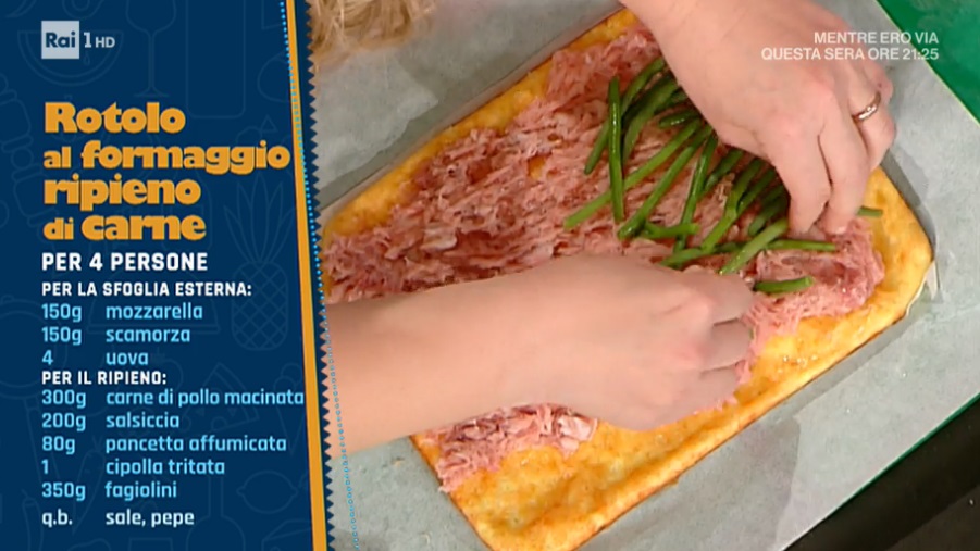 Lavoriamo, quindi, il macinato di pollo insieme alla salsiccia sgranata, la pancetta affumicata e la salsiccia tritata. Ottenuto un composto omogeneo, lo spalmiamo sulla crosta di formaggio. Distribuiamo sopra i fagiolini sbollentati, tutti d’un verso. Arrotoliamo il polpettone e cuociamo in forno per 40 minuti a 180°.