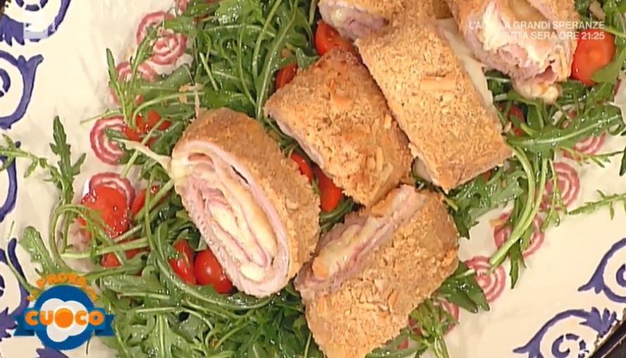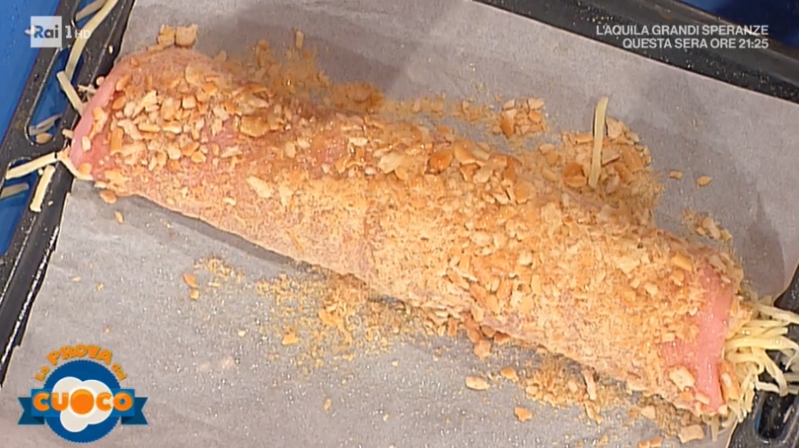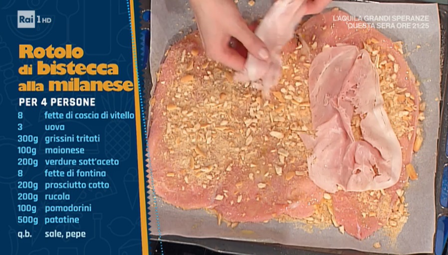 Su un foglio di carta forno, disponiamo le fettine di carne, sovrapponendole leggermente. Copriamo con un altro foglio di carta e battiamo con il batticarne, in modo da assottigliare le fettine. Spennelliamo il rettangolo di carne ottenuto con l’uovo sbattuto. Spolveriamo con i grissini tritati grossolanamente. Capovolgiamo il rettangolo di carne sulla carta forno ed impaniamo anche l’altro lato (spennelliamo e cospargiamo con i grissini sbriciolati). Distribuiamo sopra il prosciutto affettato e copriamo con tutta la fontina grattugiata.