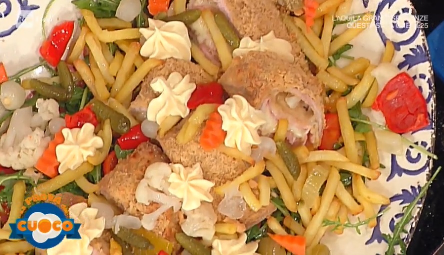 - 8 fette di coscia di vitello, 3 uova, 300 g grissini, 100 g maionese, 200 g verdure sott’aceto, 8 fette di fontina, 200 g prosciutto cotto, 200 g rucola, 100 g pomodorini, 500 g patatine, sale, pepe