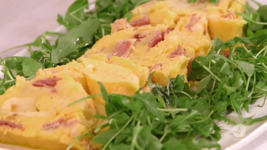 Distribuiamo il composto alla base di una teglietta rettangolare foderata con carta forno. Cuociamo in forno preriscaldato a 180° per 15 minuti. Lasciamo intiepidire, quindi distribuiamo sopra la provola a fettine sottili. Arrotoliamo il rettangolo di patate su se stesso, partendo dal lato lungo ed aiutandoci con la carta forno, che chiudiamo a caramella: otterremo un grosso salsicciotto, ripieno di provola. Rimettiamo in forno caldo per 5-10 minuti. Lasciamo intiepidire, togliamo la carta forno e serviamo a fette.