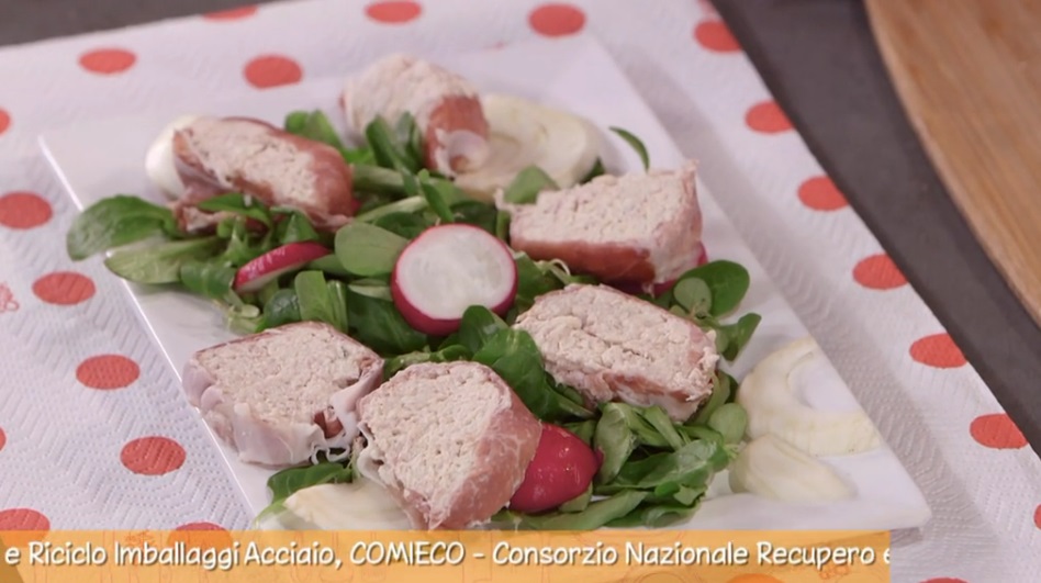 Su un foglio di pellicola, disponiamo le fettine di prosciutto crudo, in modo da ottenere un rettangolo. Spalmiamo sopra il composto di pollo e formaggio. Arrotoliamo stretto, formando un rotolo. Avvolgiamo nella carta d’alluminio e lasciamo riposare in frigorifero per 12 ore circa.