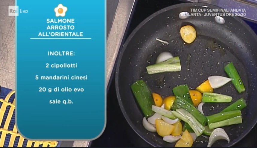 Per il contorno, in padella saltiamo del cipollotto a trancio e mandarini cinesi a spicchi con il filo d’olio. Facciamo rosolare per bene, quindi saliamo e serviamo con il salmone.