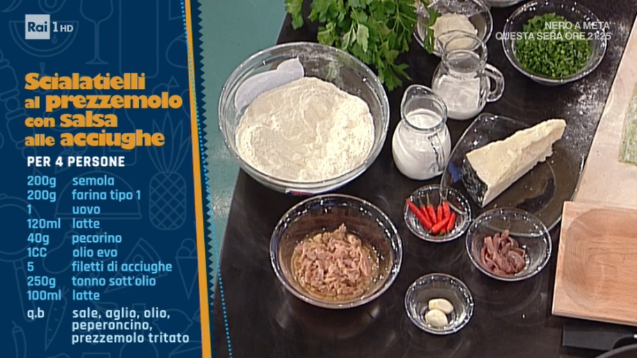 - 1 cucchiaio olio evo, 5 filetti di acciughe, 250 g tonno sott’olio, 100 ml latte, sale, aglio, olio, peperoncino, prezzemolo tritato