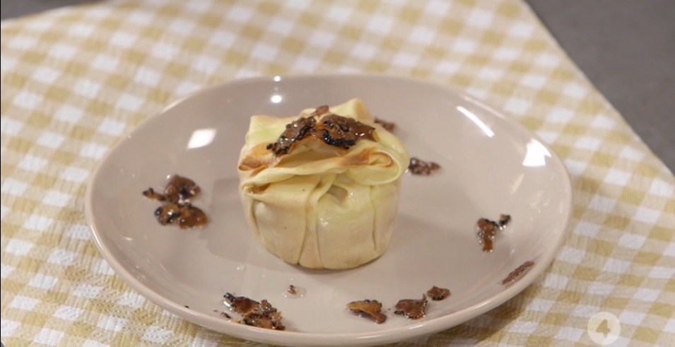Inseriamo ciascuna crespella all’interno di uno stampino monoporzione in alluminio. Farciamo con il composto di pollo e tartufo e richiudiamo la crespella sul ripieno. Passiamo in forno caldo e statico a 180° per 10 minuti. Sformiamo su un piatto da portata.