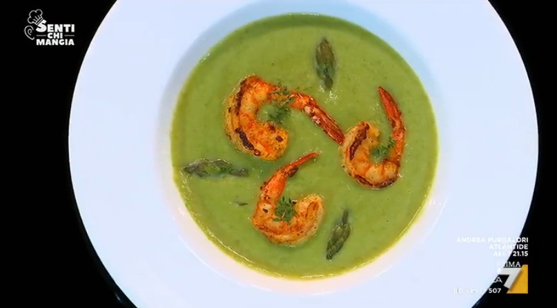 vellutata di asparagi con gamberiBenedetta Parodi torna in cucina. Tra ricette stellate e concorrenti svogliati, l’abile cuoca (e conduttrice) di Senti chi mangia, il cooking show di La7 in onda dal lunedì al venerdì alle 17:00, propone idee ‘salva cena‘ con pochi e semplici ingredienti, spesso avanzati da altre preparazioni. Oggi, Benedetta prepara un piatto unico raffinato, la vellutata di asparagi con gamberi.