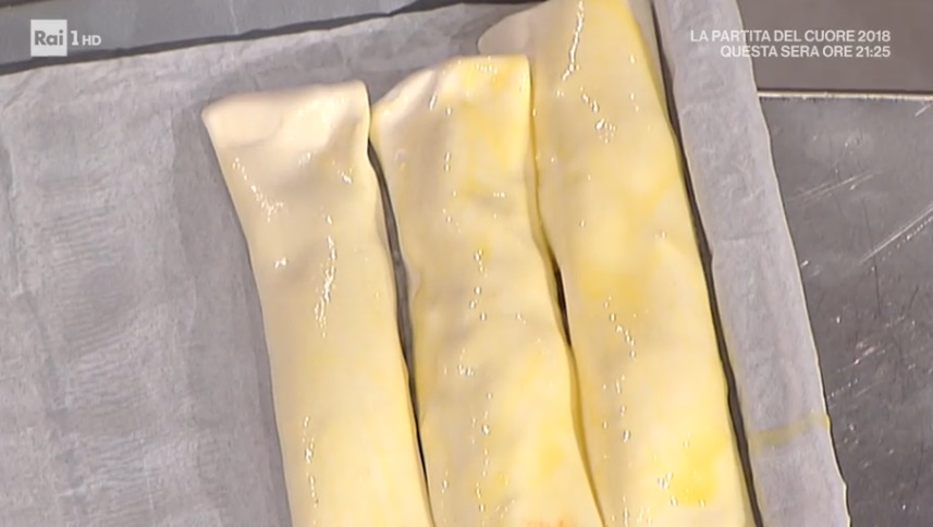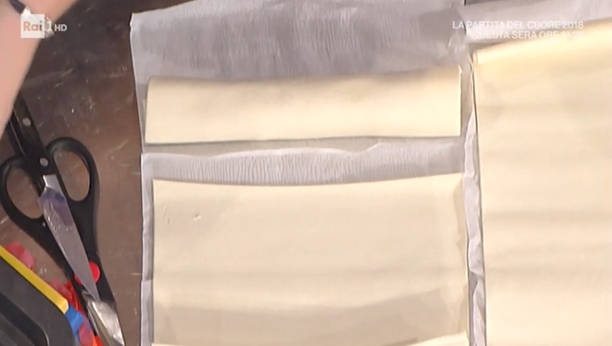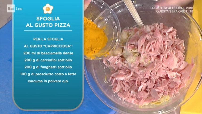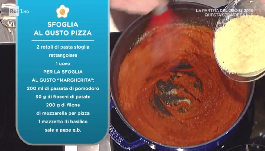 Ad aprire il menu di oggi è Andrea Mainardi, che propone un piatto veloce, da preparare con la base di sfoglia già pronta, ed estremamente goloso. Ecco la sfoglia al gusto pizza.