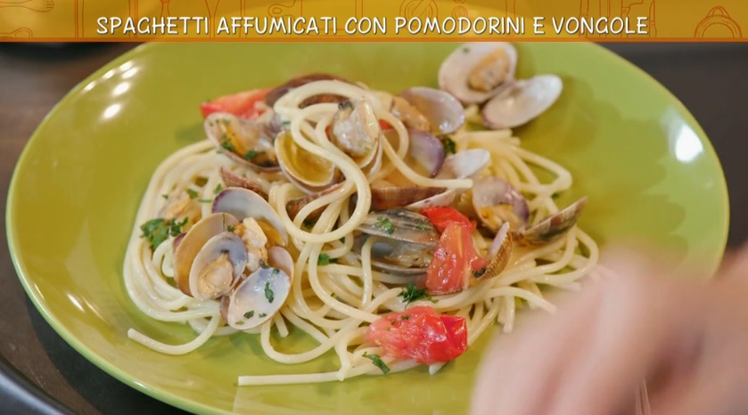 La cuoca casalinga Anna Moroni, reduce da una pluriennale esperienza ai fornelli de La prova del cuoco, all’interno della puntata odierna di Ricette all’italiana, il programma di Rete4 condotto da Davide Mengacci, ha preparato un primo con le vongole ed un piatto del recupero: i spaghetti affumicati e frittata di pasta.
