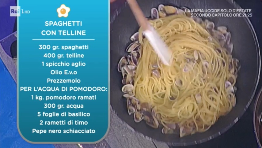 Per prima cosa facciamo aprire le telline in padella, con un filo d’olio, aglio, olio e peperoncino. Sfumiamo con il vino bianco, copriamo e lasciamo che si aprano.