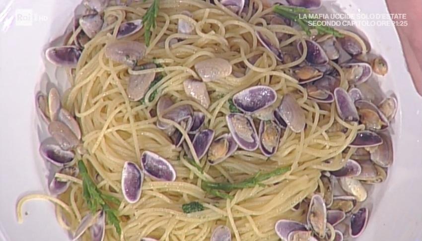 - 300 g spaghetti, 400 g telline, 1 spicchio d’aglio, olio evo, prezzemolo