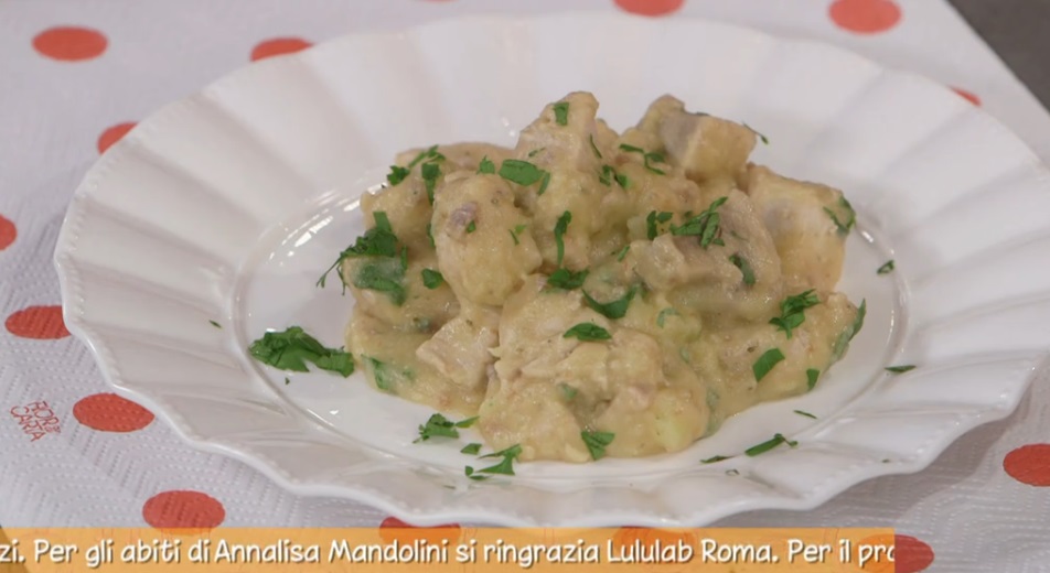 - 1 Kg spezzatino di tacchino, 600 g patate, 400 g funghi champignon, 50 g gambuccio di prosciutto, 4 tuorli, mezza cipolla, 1 ciuffo di prezzemolo, 1 cucchiaio di farina, 1 bicchiere di vino bianco