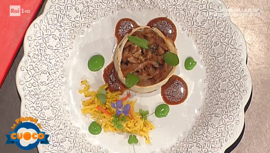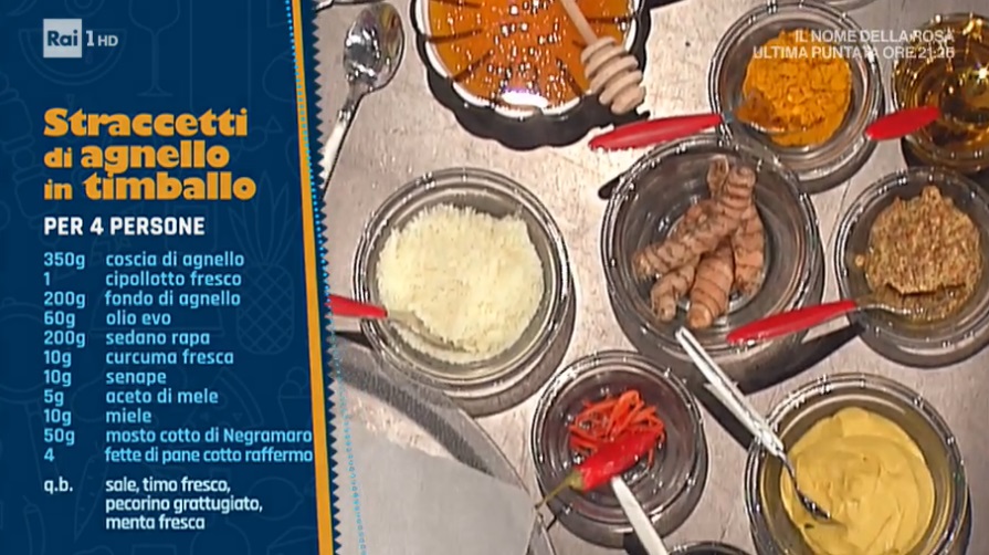 Il giudice stellato della settimana, la pugliese Antonella Ricci, prepara un piatto che la rappresenta insieme al marito Vinod Sokar. Ecco, quindi, gli straccetti d’agnello in timballo.