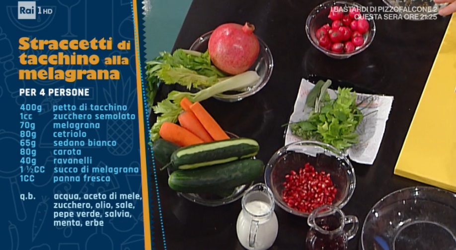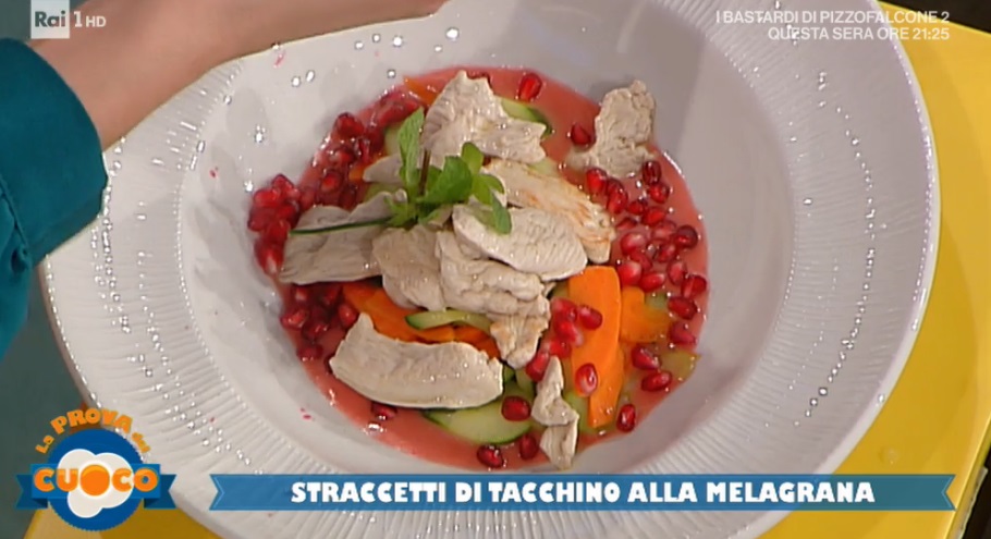 Ad aprire la settima settimana di questa nuova, sfortunata edizione de La prova del cuoco è un piatto a base di melagrana, straordinario ingrediente del giorno. A prepararcelo è Roberto Carcangiu, cuoco sardo. Ecco gli straccetti di tacchino alla melagrana.