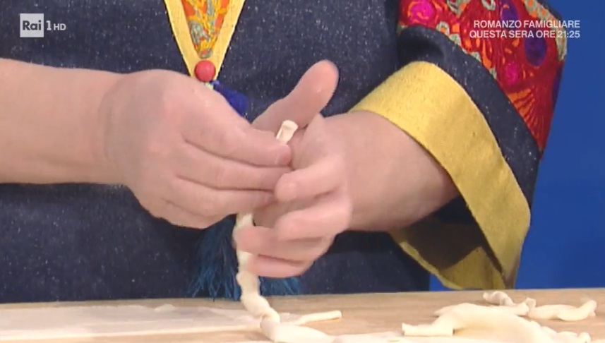 Per la sfoglia, impastiamo la farina con l’acqua. Facciamo riposare una mezz’ora, poi tiriamo la sfoglia sottile. Ritagliamo delle strisce e diamo la forma di strozzapreti, arrotolando le strisce tra i palmi delle mani.