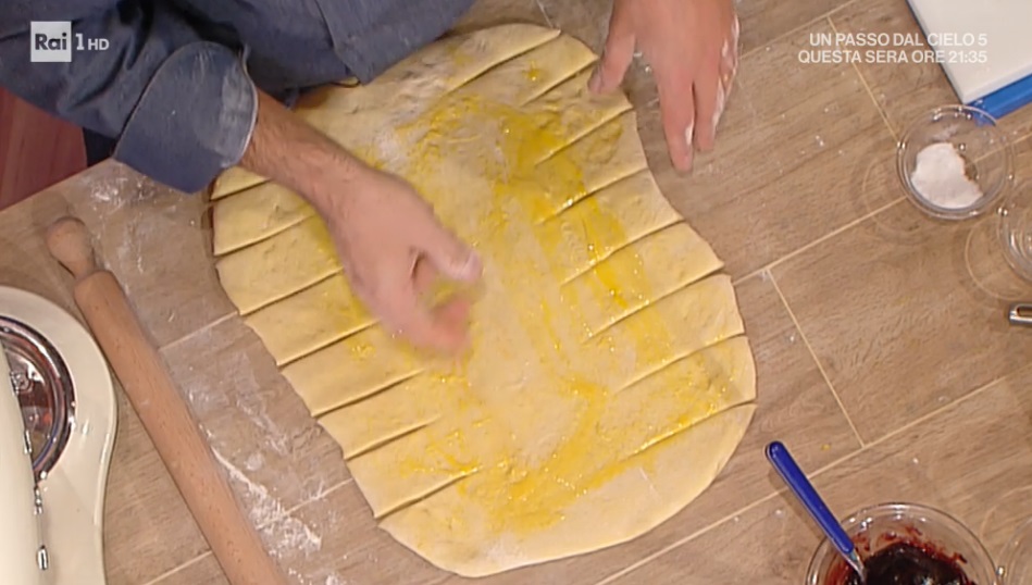 In alternativa, pratichiamo dei tagli sui bordi lunghi del rettangolo (foto) e disponiamo la farcitura solo sulla parte centrale. Incrociamo infine i lembi sul ripieno.