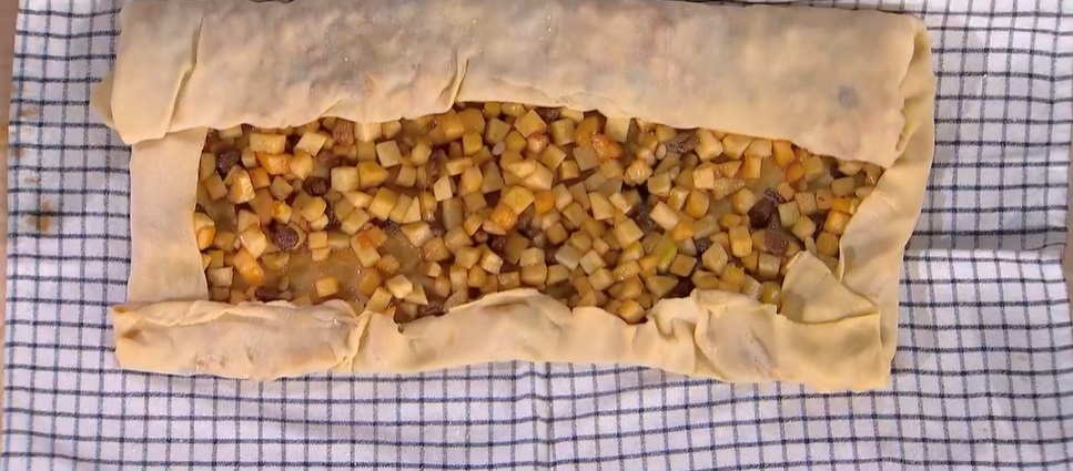 Stendiamo l’impasto con il mattarello, su un canovaccio infarinato, sottilissimo: dev’essere un rettangolo trasparente, più della pasta all’uovo. Spennelliamo con un velo di burro fuso. Spolveriamo con il pangrattato e distribuiamo il ripieno, scolandolo del sughetto che si è formato e lasciando liberi 2 cm dai bordi. Ripieghiamo i bordi sul ripieno, quindi arrotoliamo partendo dal lato lungo, in modo da ottenere un salsicciotto. Trasferiamo su una teglia con carta forno, rivolgendo la congiuntura verso il basso. Spennelliamo con altro burro e spolveriamo con zucchero a velo. Cuociamo in forno caldo e statico a 180° per 15 minuti, abbassiamo a 170° e lasciamo cuocere per altri 20 minuti.