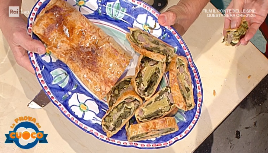 Stendiamo la briseè all’altezza di pochi mm. Dobbiamo ottenere un rettangolo. Mettiamo al centro tutto il ripieno freddo di cime di rapa e salsiccia. Distribuiamo sopra anche la caciotta a scaglie. Richiudiamo la briseè sul ripieno, sigillando bene le estremità. Spennelliamo con rosso d’uovo sbattuto e inforniamo a 180° per 40 minuti. Dev’essere ben dorato.