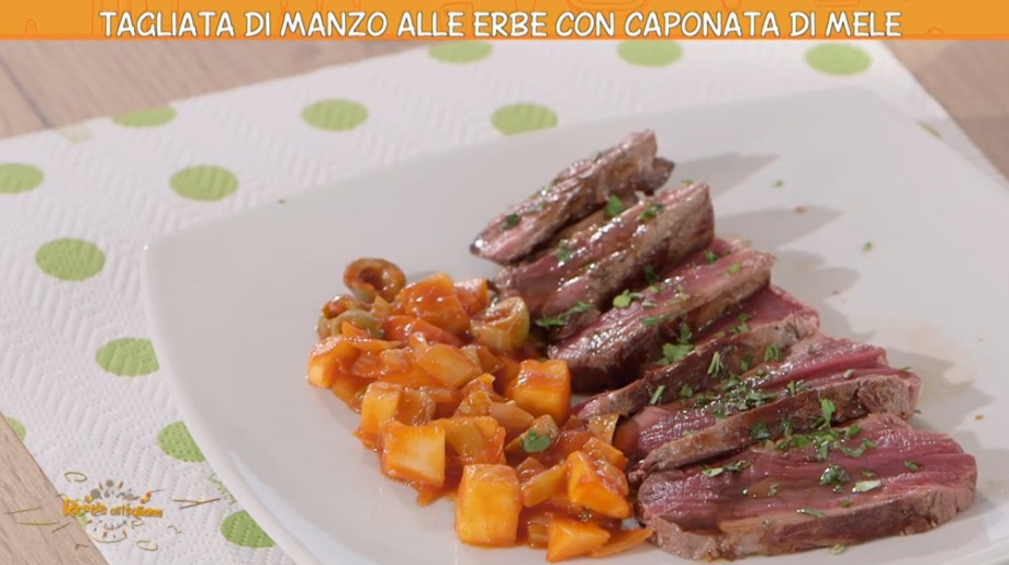 La cuoca casalinga Anna Moroni, all’interno della puntata odierna di Ricette all’italiana, il programma di Rete4 condotto da Davide Mengacci, in onda dal lunedì al sabato prima e dopo il Tg4, ha preparato la tagliata di manzo alle erbe con caponata di mele.