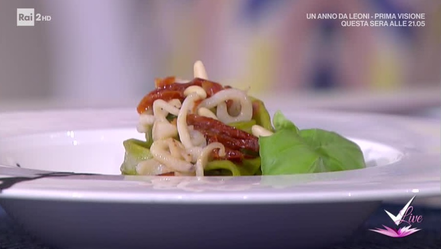 In padella, scaldiamo l’olio con i pinoli, i calamari a julienne e i pomodorini essiccati. Sfumiamo con un mestolo di acqua di cottura della pasta.
