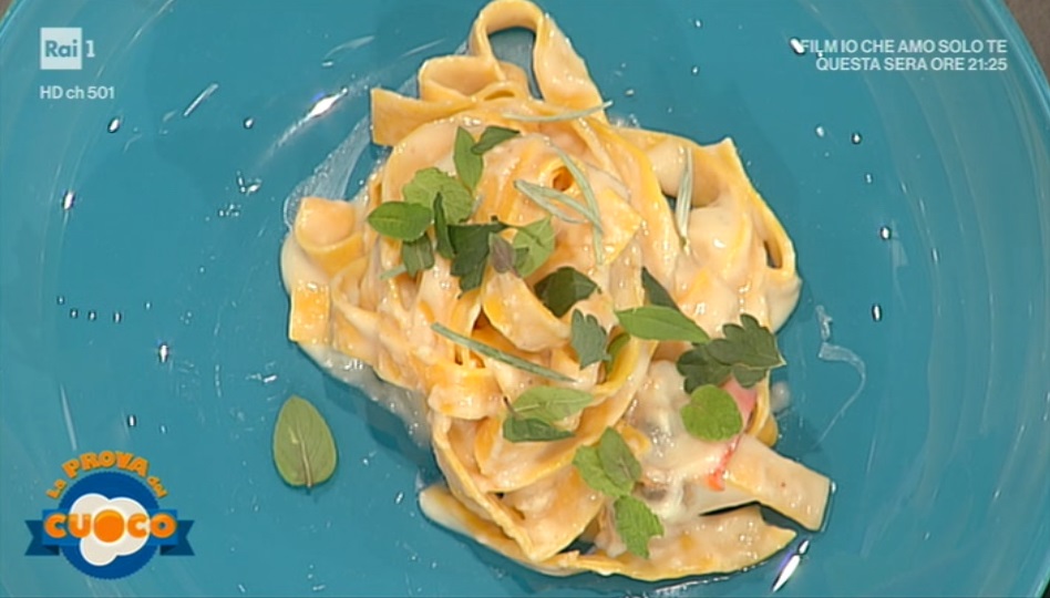 Prepariamo la pasta all’uovo con il classico procedimento: impastiamo farina (120 g) ed uova (70-80 g), quindi lasciamo riposare il panetto per una mezz’ora, coperto. Tiriamo la sfoglia non troppo sottile e tagliamo le tagliatelle. Le scottiamo in acqua bollente e salata per pochi minuti.