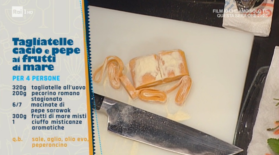 - 320 g tagliatelle all’uovo, 200 g pecorino romano stagionato, 6-7 macinate di pepe sarawak, 300 g frutti di mare misti, 1 ciuffo misticanze aromatiche, sale, aglio, olio evo, peperoncino