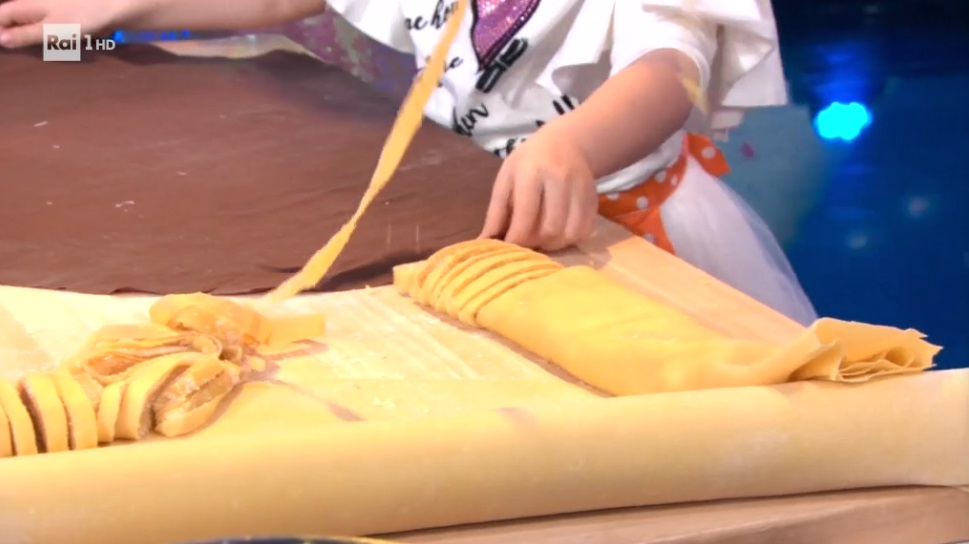 Tiriamo la sfoglia sottile, con il mattarello o l’apposita macchinetta. Spolveriamo la superficie della sfoglia con lo zucchero ed abbondante scorza di limone grattugiata. Arrotoliamo la sfoglia su se stessa, in modo da ottenere un rotolo. Tagliamo quest’ultimo a fette spesse circa 1-2 cm.