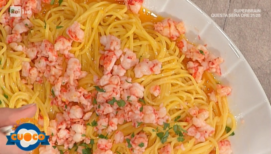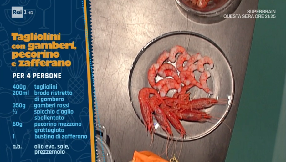 - 400 g tagliolini, 200 ml brodo ristretto di gambero, 350 g gamberi rossi, mezzo spicchio d’aglio, 60 g pecorino mezzano grattugiato, 1 bustina di zafferano, olio, sale, prezzemolo