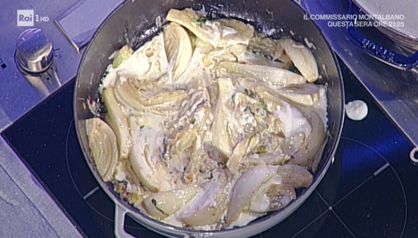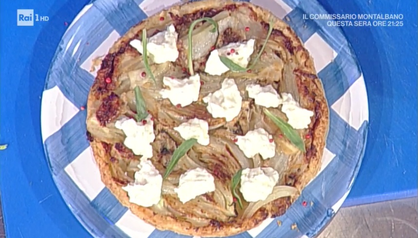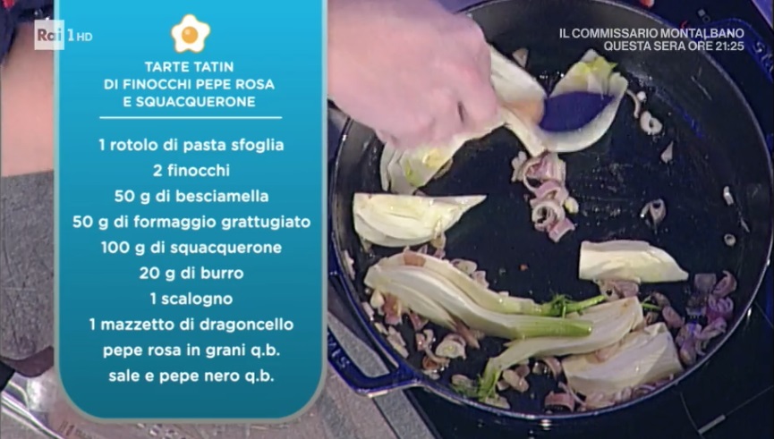 L’allegria impera in cucina e, dopo Persegani, arriva uno scatenato Andrea Mainardi. Oggi una torta salata golosa e sorprendente. Ecco la tarte tatin di finocchi pepe rosa e squacquerone.