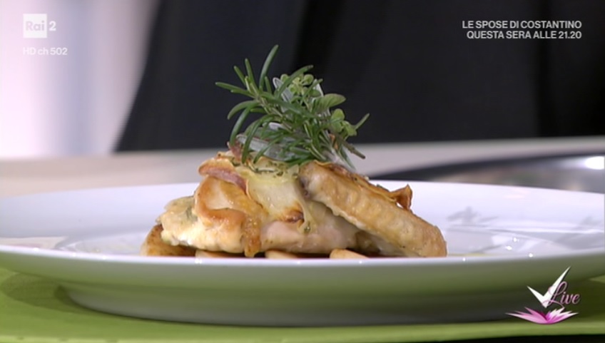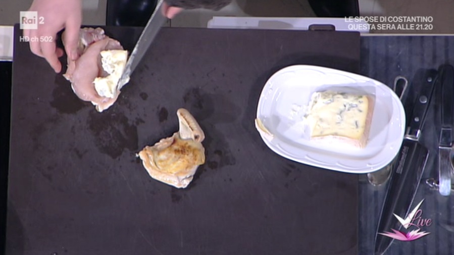 Rosoliamo il petto di pollo in padella, fino a formare una crosticina dorata. Incidiamo al centro, in modo da creare una tasca. Inseriamo all’interno di quest’ultima un bel pezzo di gorgonzola. Posizioniamo i petti di pollo su una teglia coperta con carta forno. Copriamo con delle rondelle di patate sottilissime, come fossero delle squame. Inforniamo a 180° per 20 minuti circa. Il pollo dev’essere ben cotto.
