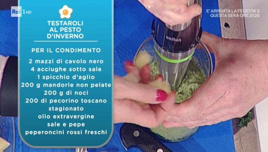 - Pesto: 2 mazzi di cavolo nero, 4 acciughe sotto sale, 1 spicchio d’aglio, 200 g mandorle non pelate, 200 g noci, 200 g pecorino toscano stagionato, olio evo, sale e pepe, peperoncini rossi freschi