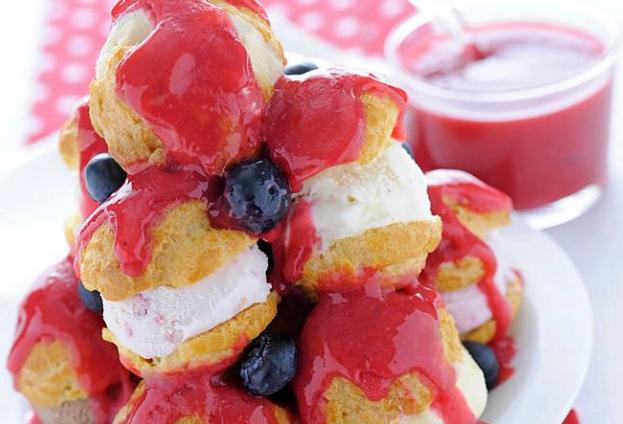 Ingredienti: 12 bignè pronti, 400 g di gelato o gelati diversi nei gusti preferiti, 5 g di gelatina in fogli, 250 g di lamponi, 50 g di gelatina di ribes, qualche mirtillo.