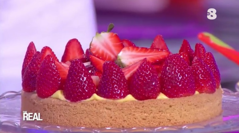Spalmiamo il cremoso sulla torta fredda. Copriamo con delle fragole, che prima mescoliamo con un po’ di gelatina neutra.