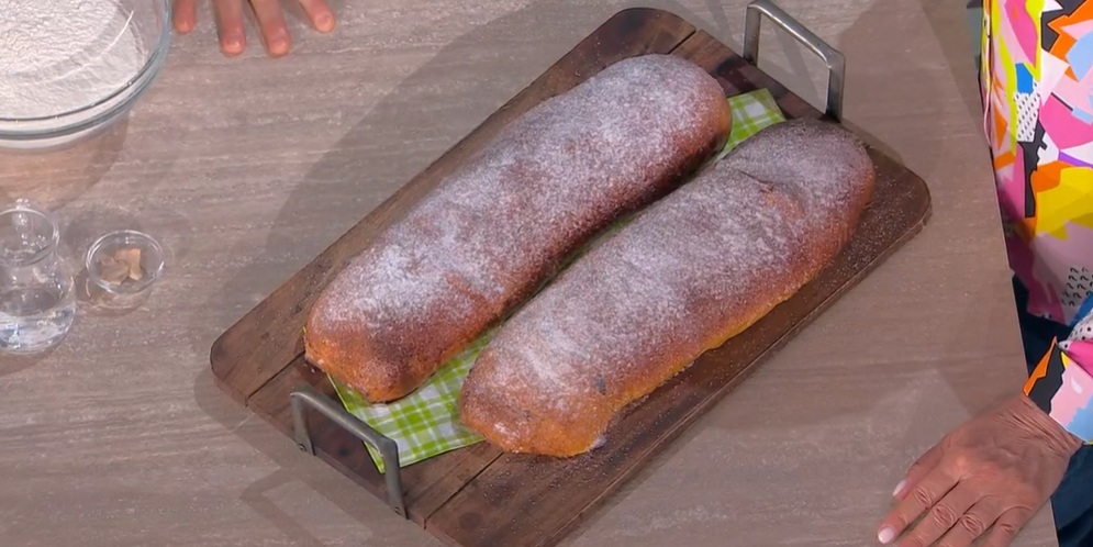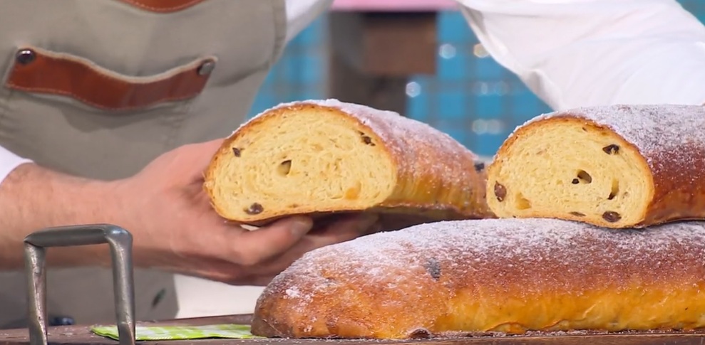 tirà piemontese di Fulvio MarinoNel forno di Fulvio Marino, oggi, c’è un’amica speciale, l’instancabile Anna Moroni. Lei, che l’ha visto crescere tra i banchi de ‘La prova del cuoco’, oggi assiste con interesse alla preparazione di lievitato richiesto da una telespettatrice, un pane dolce, il tirà piemontese.