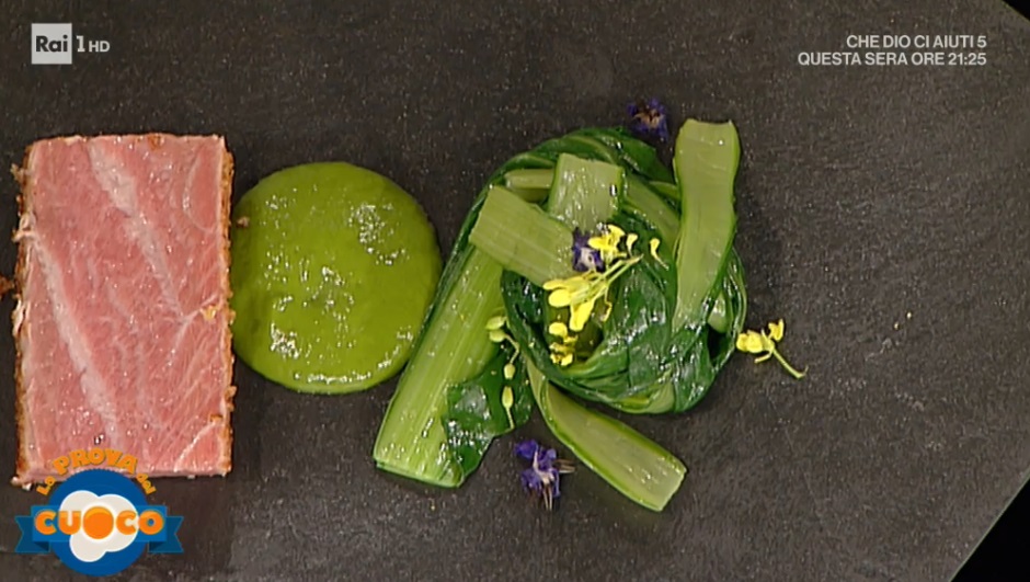 Serviamo il trancio di tonno con le bietole saltate e la salsa. Finiamo con fiori di borragine e senape.
