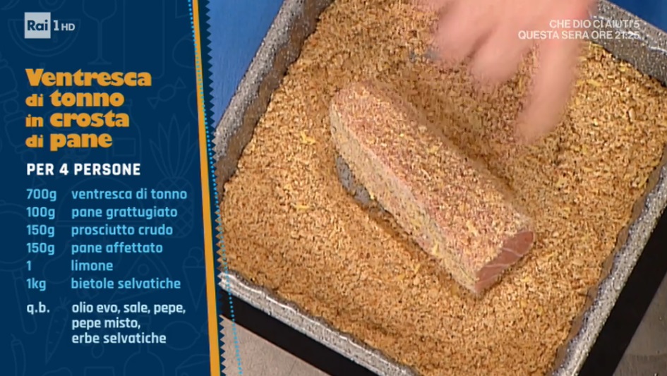 - 700 g ventresca di tonno, 100 g pane grattugiato, 150 g prosciutto crudo, 150 g pane affettato, 1 limone, 1 Kg bietole selvatiche, olio, sale, pepe, erbe selvatiche
