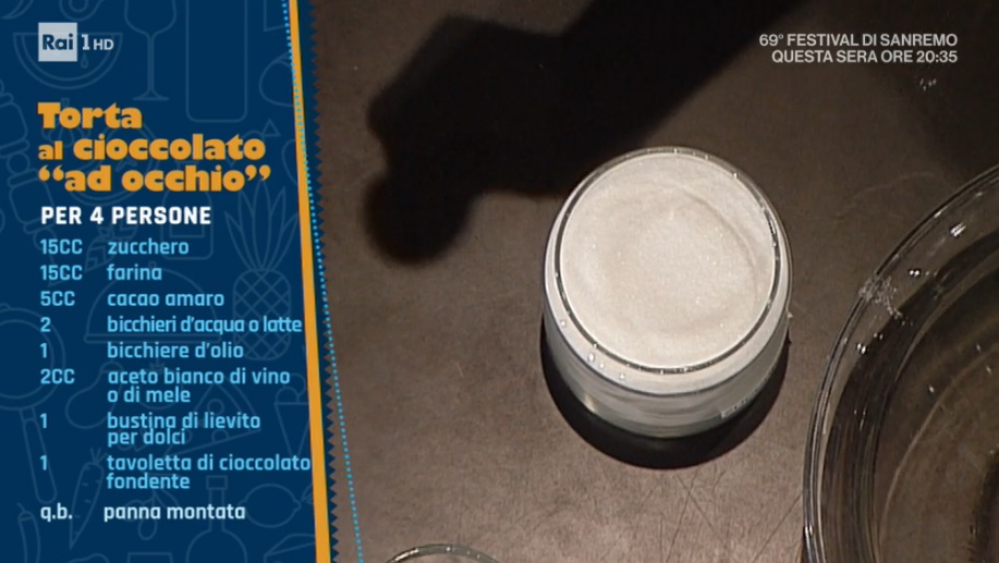 - 15 cucchiai di zucchero, 15 cucchiai di farina, 5 cucchiai di cacao amaro, 2 bicchieri d’acqua o latte, 1 bicchiere d’olio, 2 cucchiai di aceto bianco di vino o mele, 1 bustina di lievito per dolci, 1 tavoletta di cioccolato fondente
