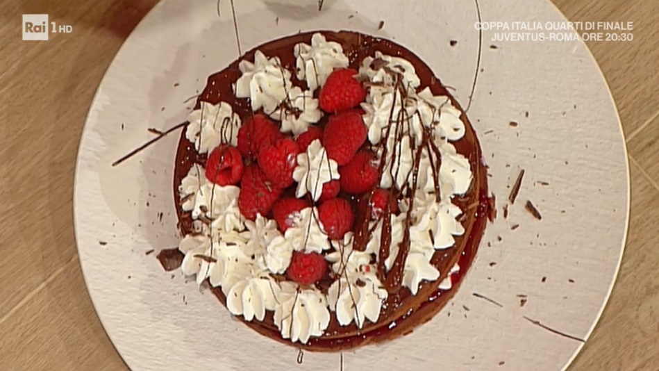 Posizioniamo il primo disco di pan di Spagna sul piatto da portata. Spalmiamo sopra la confettura di lamponi e copriamo con dei ciuffi di crema al mascarpone. Copriamo con il secondo strato di pan di Spagna e spalmiamo sopra il cioccolato fondente fuso. Finiamo con ciuffi di crema al mascarpone, lamponi freschi e cioccolato a scaglie.