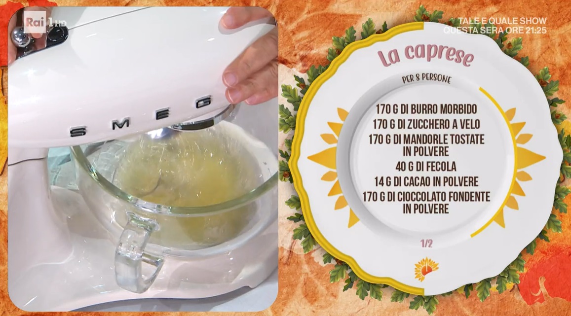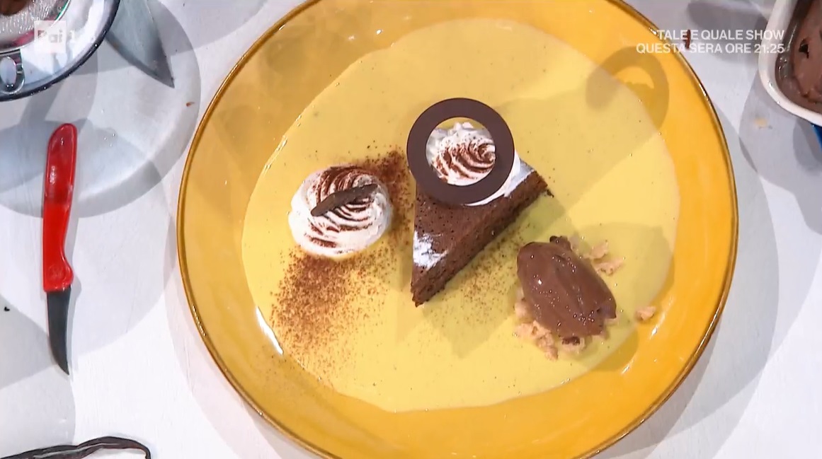 - 170 g burro, 170 g zucchero a velo, 170 g mandorle tostate in polvere, 40 g fecola, 14 g cacao in polvere, 170 g cioccolato fondente in polvere, 85 g tuorli, 150 g albumi, 4 g lievito per dolci, vaniglia, 2 g sale
