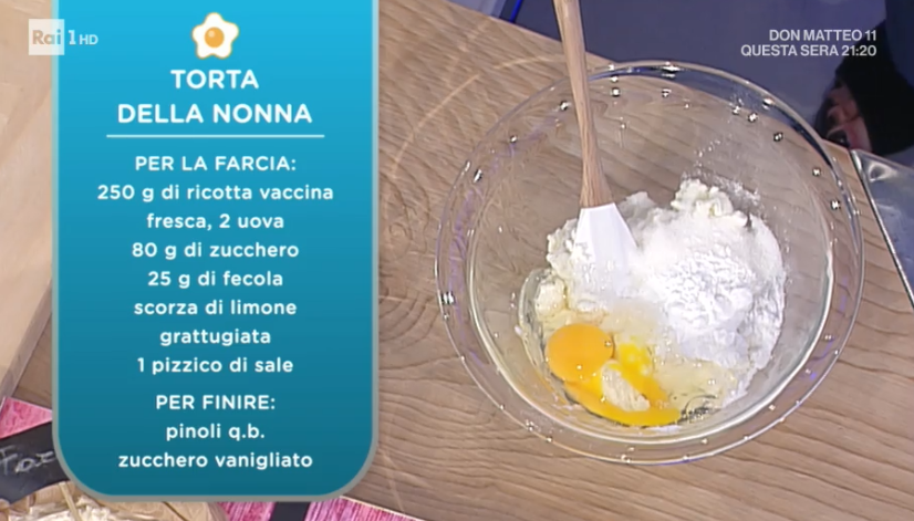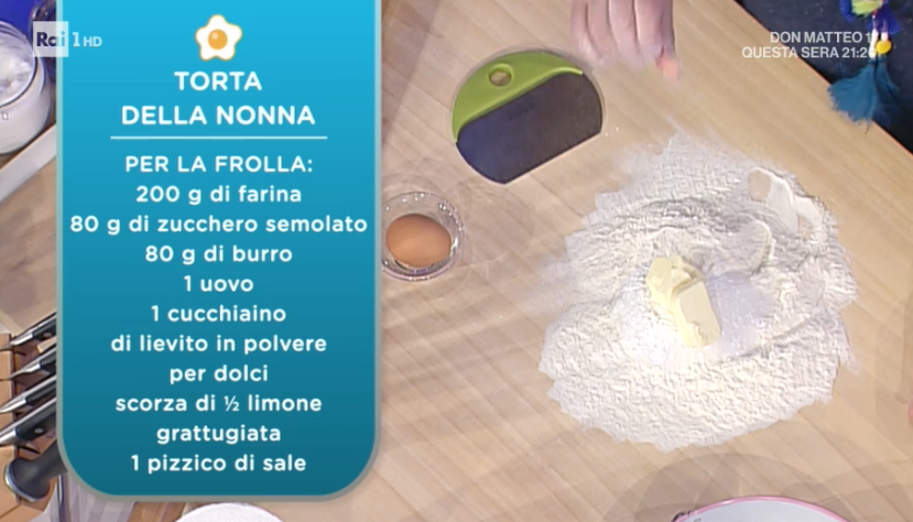 Infine, è il turno di Alessandra Spisni, oggi in postazione dolce. La sfoglina bolognese prepara un dolce semplice e ‘personale’, con una farcia da lei ideata. Prepariamo la torta della nonna.