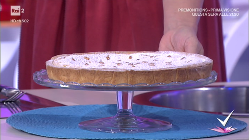 Stendiamo la frolla all’altezza di mezzo cm e trasferiamo all’interno di una tortiera imburrata. Inseriamo all’interno del guscio di frolla crudo la crema pasticcera. Copriamo con un altro disco di frolla e sigilliamo per bene i bordi, eliminando l’eccesso. Bucherelliamo con una forchetta e disponiamo sopra i pinoli. Inforniamo a 160° per 40 minuti circa. Lasciamo raffreddare e spolveriamo con lo zucchero a velo.