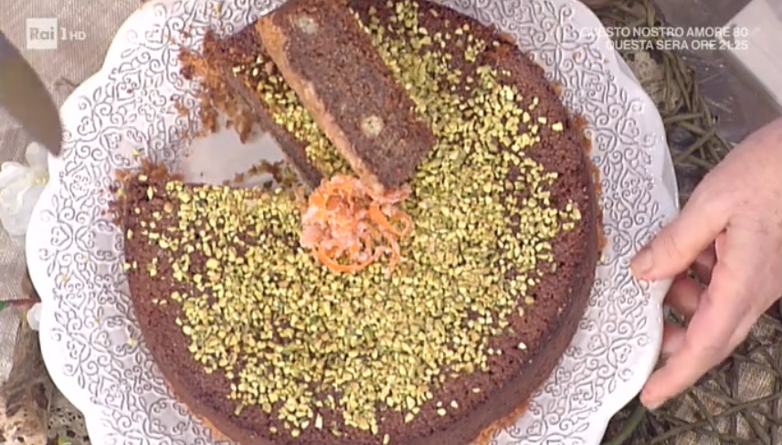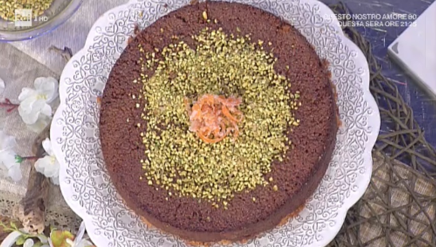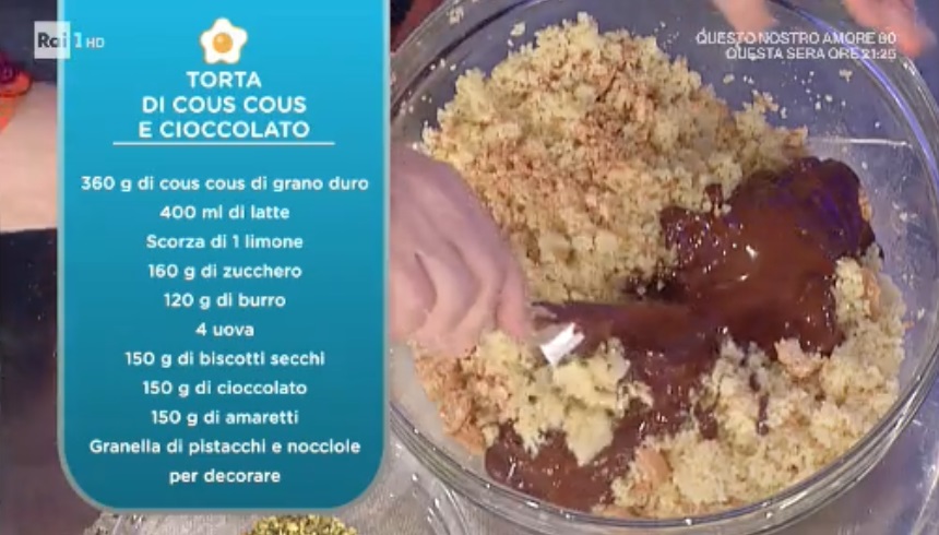 - 360 g cous cous di grano duro, 400 ml latte, scorza di 1 limone, 160 g zucchero, 120 g burro, 4 uova, 150 g biscotti secchi, 150 g cioccolato fondente, 150 g amaretti secchi, granella di pistacchi e nocciole per decorare