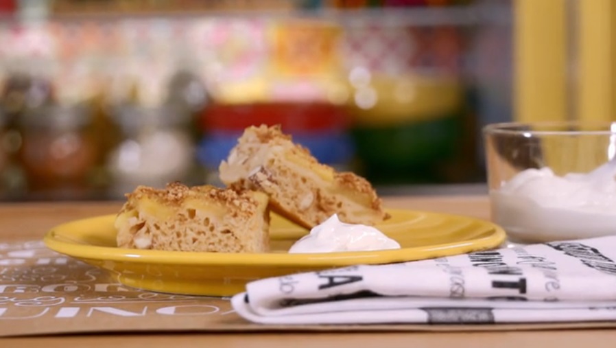 Tritiamo con un coltello mandorle e nocciole. In una ciotola mettiamo la farina, il lievito, lo zucchero (potete ometterlo), il latte e mescoliamo con un cucchiaio, in modo da ottenere una pastella fluida. Possiamo sostituire il latte con una bevanda vegetale. Aggiungiamo la frutta secca tritata grossolanamente, gli amaretti sbriciolati (metà; l’altra metà andrà sulla superficie). Versiamo l’impasto ottenuto sulla leccarda del forno coperta con carta forno. Disponiamo sopra le mele spadellate e finiamo con l’altra metà degli amaretti sbriciolati. Inforniamo a 180° per 30-40 minuti.