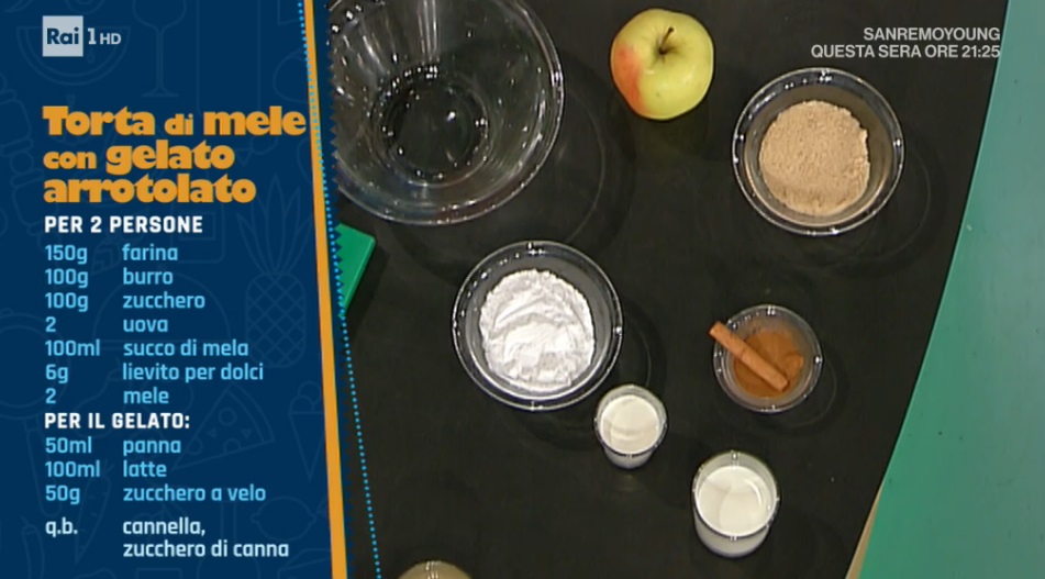 Nel duello di mezzogiorno, Diego Bongiovanni, in soli 10 minuti, ha preparato una torta al microonde ed un gelato istantaneo. Vediamo come preparare in casa una torta di mele con gelato alla cannella.