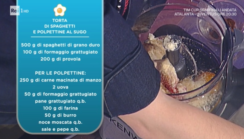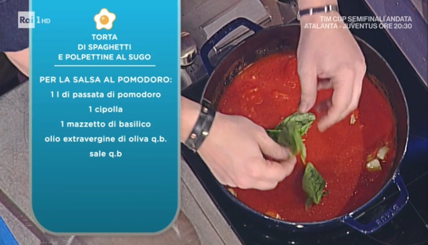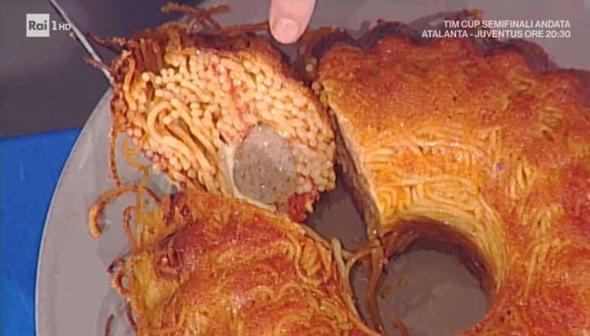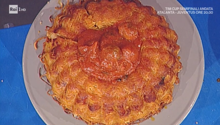 Come da tradizione, dopo Persegani arriva Mainardi. Il cuoco, scatenatissimo, prepara uno dei suoi primi piatti esagerati e conviviali. Ecco la torta di spaghetti e polpettine al sugo.